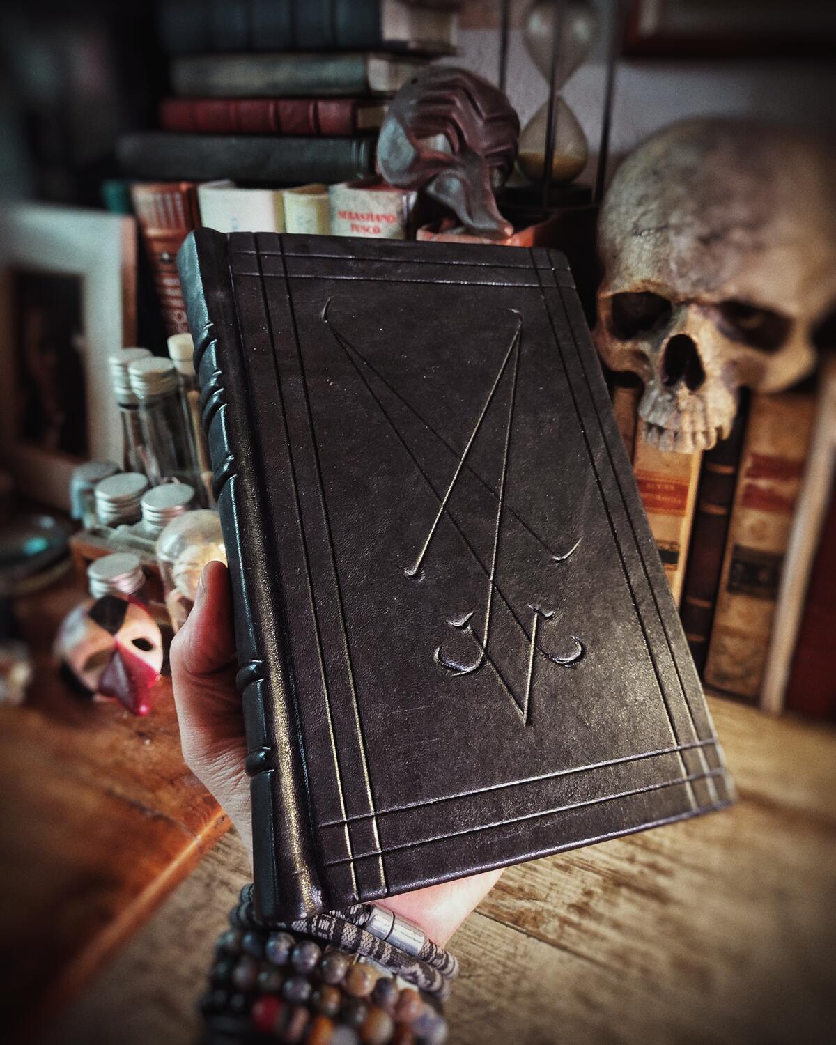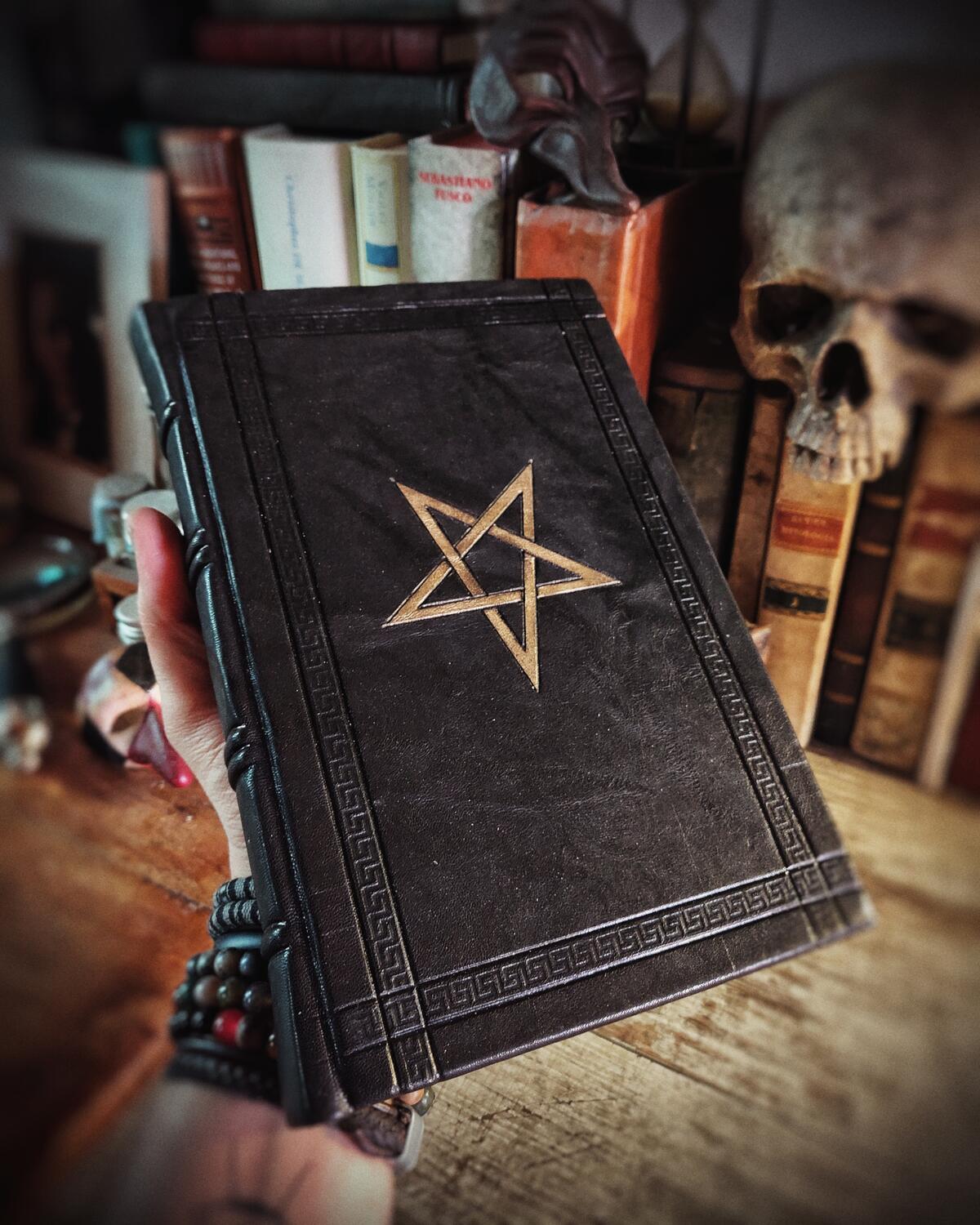 Horrido Delomelanicon - formato 21x15 cm, rilegato in piena pelle nera con pentacolo di Lucifero inciso: Vedi qui la scheda prodotto dettagliata